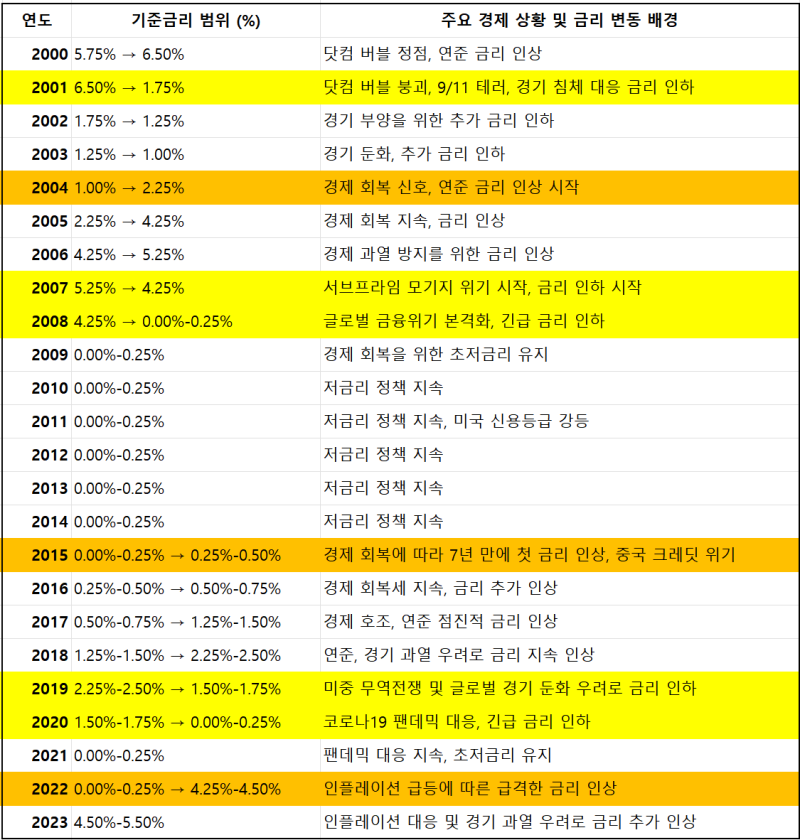 위 표는 2000년부터 2023년까지 금리 변화를 나타낸 것이다. 2024년에는 아직 금리 변동이 없어서 넣지 않았으나 곧, 9월 FOMC에서 확정적으로 25bp 인하가 예상되며, 금년 내 1%의 인하가 될 것으로 보인다(25, 50, 25). 또, 노란색은 인하를 시작한 시기, 주황색은 인상을 시작한 시기다.