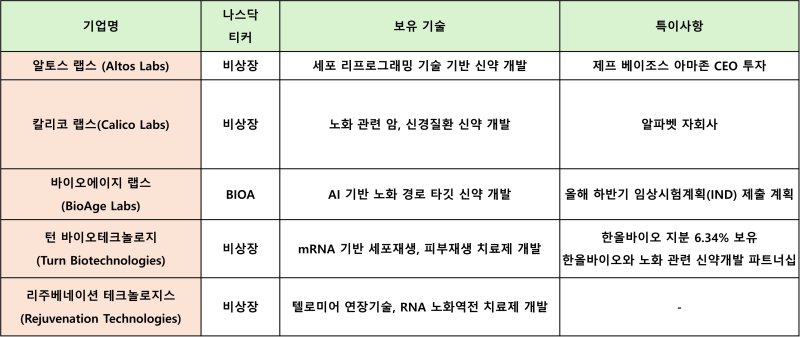 제프 베조스(Jeff Bezos) 아마존(Amazon) 창업자는 지난 2021년 항-노화 치료제를 개발하는 알토스랩스(Altos Labs)에 투자했다. 글로벌 IT기업 구글 알파벳(Alphabet)도 아서 레빈슨 전(前) 제넨텍 대표와 칼리코(Calico Labs)를 설립하고 항-노화 치료제를 개발중이다.