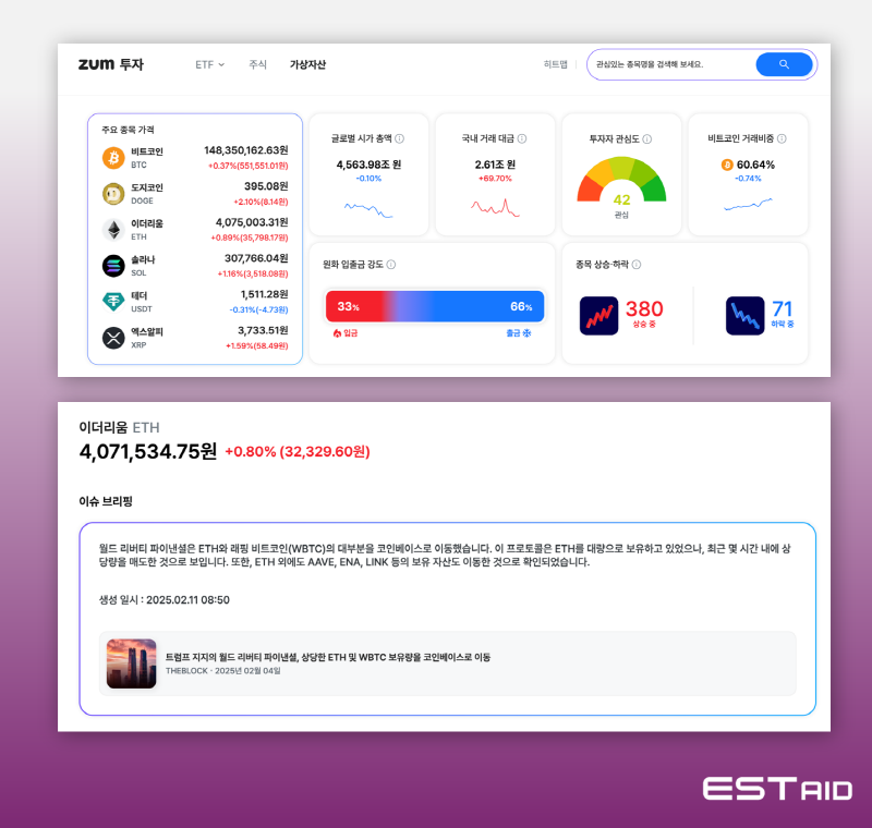 한편 이스트에이드의 포털 줌(ZUM)에서 제공하는 투자정보 페이지 ‘투자줌’에 접속하면 바로 AI 가상자산 투자정보 서비스를 이용해 볼 수 있다.