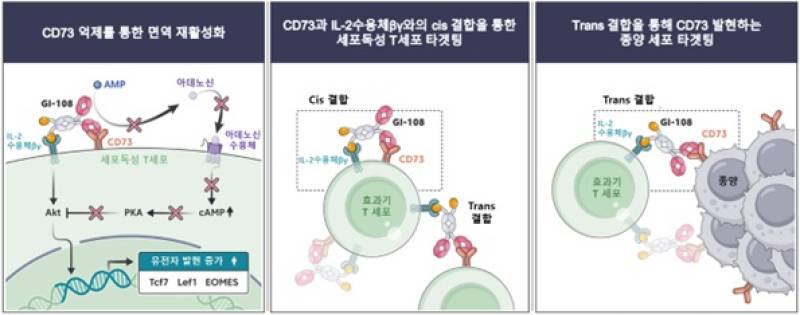 GI-108은 암세포의 대사를 억제하는 대사면역항암제다. 글로벌 제약사가 개발하고 있는 CD73 항체의 불충분한 효능을 극복하기 위해 CD73 항체와 IL-2 변이체를 융합한 이중융합 항체단백질이다.