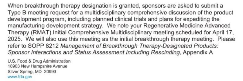 FDA가 당초 이번 회의를 RMAT를 위한 것으로 지정했으나, 혁신 치료제 지정 이후 첫 번째 회의로 활용될 계획이라고 밝혔으며, 이 회의는 임상개발 전략, 제조·생산(CMC, Chemistry, Manufacturing and Controls) 전략 등을 폭넓게 논의할 것으로 기대된다.
