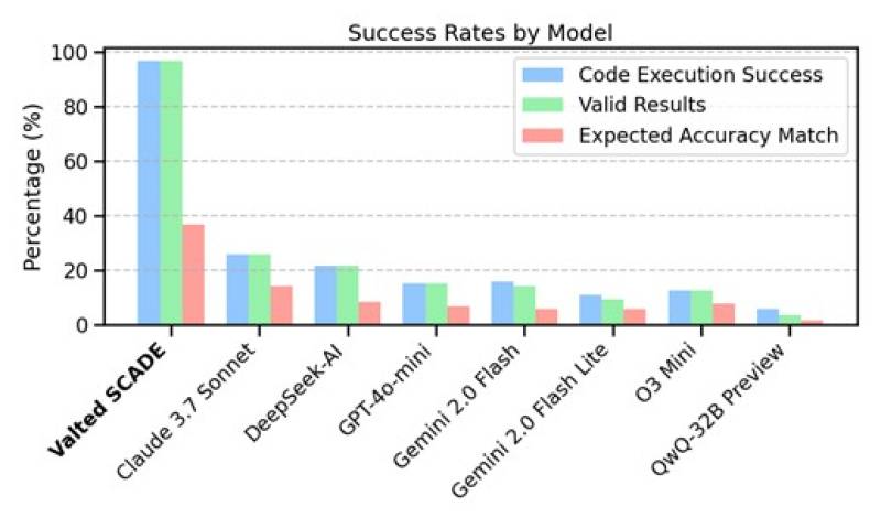 이를 기반으로 진행된 비교 시험에서 기존의 다른 AI 분석 도구들은 평가 기준인 ‘분석 코드 실행 성공률’에서 최대 25%, ‘예상 결과와의 정확도’에서 최대 14%에 그쳤다. 반면 SCADE의 경우 ‘분석 코드 실행 성공률’ 96%, ‘예상 결과와의 정확도’ 36%라는 결과를 보였다. 타 기술 대비 최소 2배 이상 향상된 성능이다.