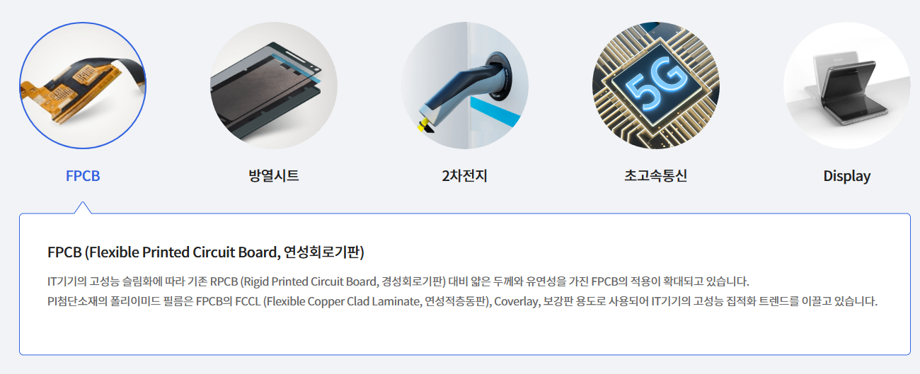 4마이크로미터(㎛) 두께인 초극박 PI필름은 회사의 연성회로기판(FPCB) 사업 부문에 포함되며, 이 부품을 활용하면 스마트폰·태블릿의 두께 감소, 내열성·내구성·절연성 확보 등의 효과를 얻을 수 있다.