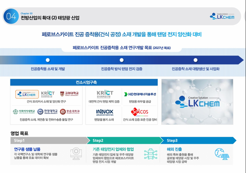 엘케이켐은 지난 2021년 한국화학연구원으로부터 페로브스카이트 태양전지 원료물질(전구물질) 기술을 이전해 왔다.