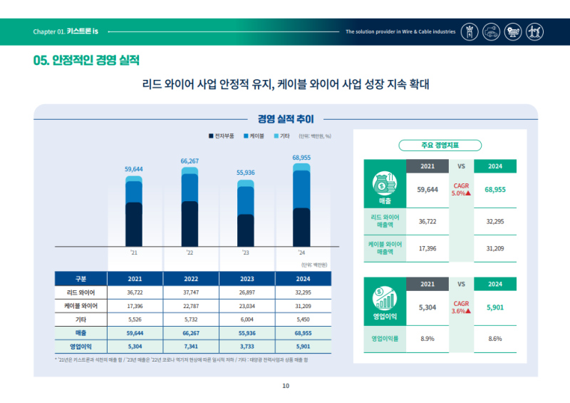 • 이에 따라 케이블 와이어 부문은 2021년을 기점으로 연평균 21%의 매출 성장을 유지하고 있음.