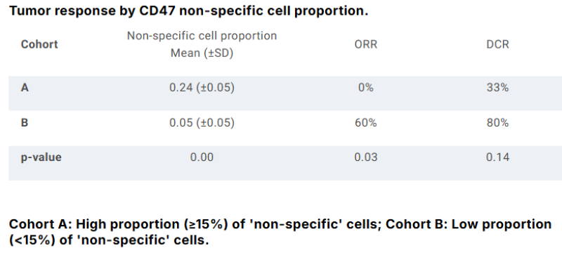 AI 모델 기반 분석한 CD47 비특이적 세포 비율 낮은(15% 미만) 환자군서 ORR 60%, DCR 80%로 효능 개선