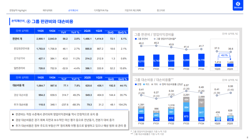 • 2분기만 놓고 보면 약 60bp 수준의 대손비용률이 발생했으며, 누적 기준으로는 약 50bp 수준