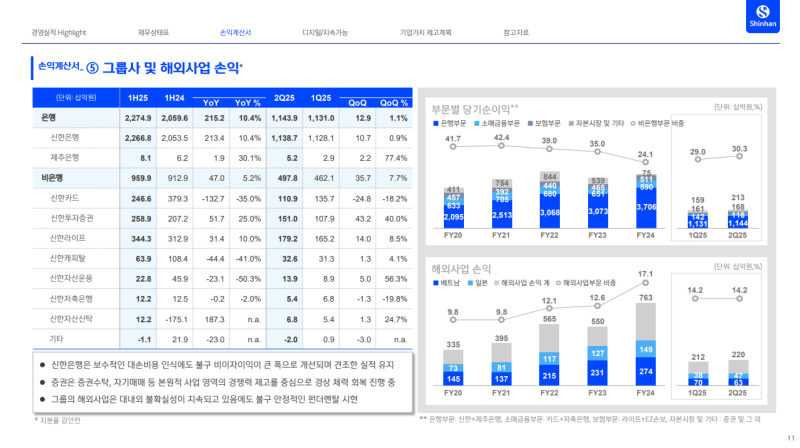 • 2025년 상반기 연환산한 ROE와 ROTCE는 전년동기대비 +0.7%p씩 개선된 11.4%, 12.9%를 기록