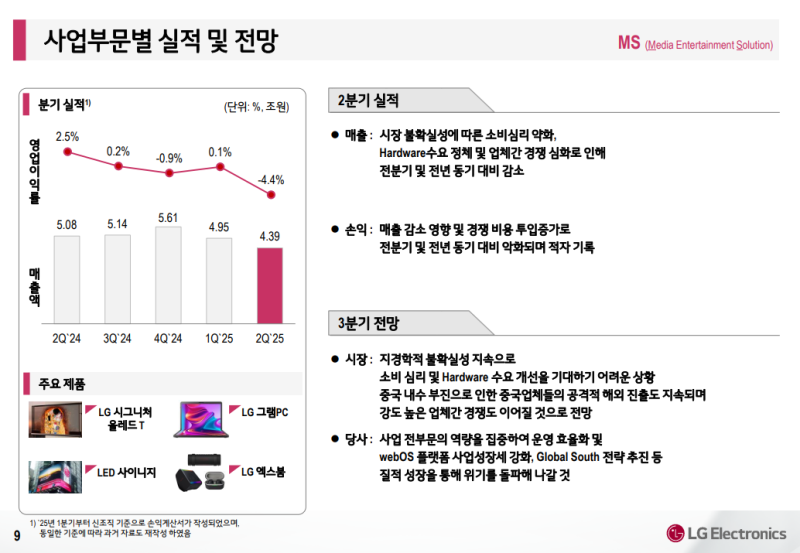 • TV 사업의 수요 정체와 경쟁 심화, 관세 부담 등으로 전사 영업이익 감소