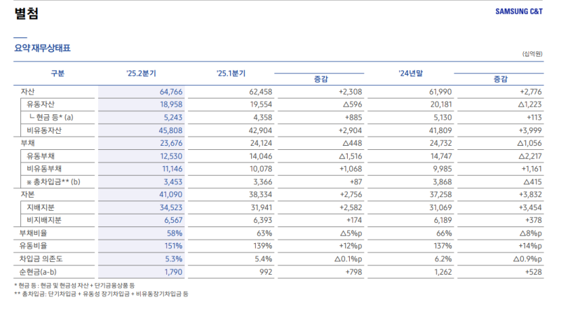 • 2분기 부채비율 58% 기록, 전분기 대비 개선되며 안정적인 재무 구조 유지
