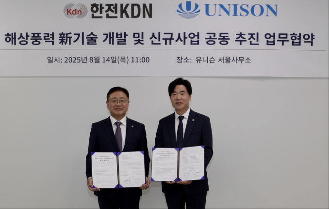 풍력발전 전문기업 유니슨이 전력 ICT 전문기업 한전KDN과 손잡고 해상풍력 기반의 ICT 융합 신사업을 공동 추진한다고 14일 밝혔다. 이날 유니슨 서울사무소에서 열린 협약식에는 유니슨과 한전KDN 양사 대표를 비롯해 주요 관계자들이 참석했다.