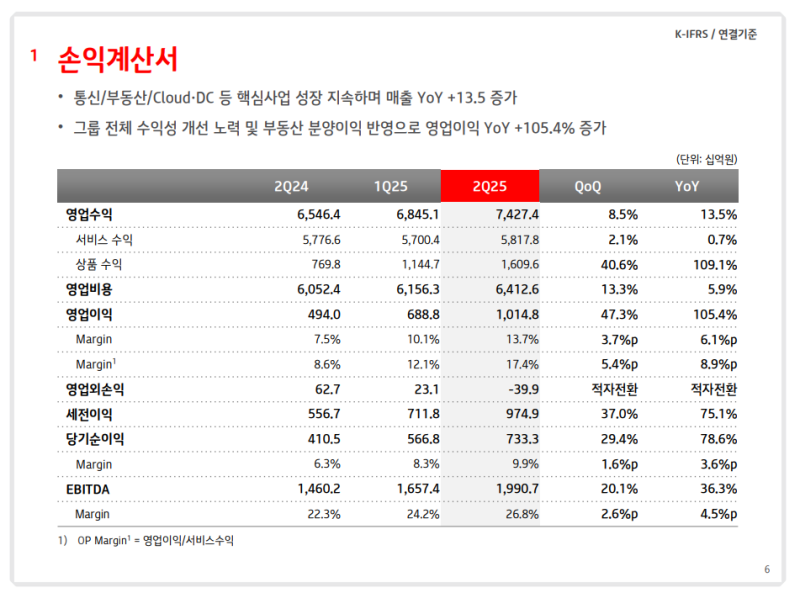 • 영업수익: 7조 4,274억원 (YoY +13.5%)