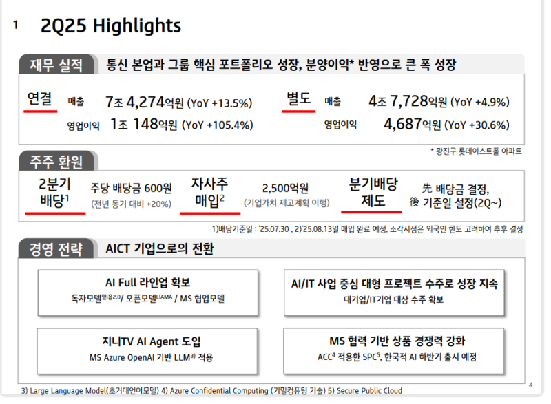 • AI 서비스 접목: 지니TV 셋톱박스 AI 에이전트 적용, 기지국 운영 효율화 등 네트워크·미디어 서비스에 AI 기술 접목