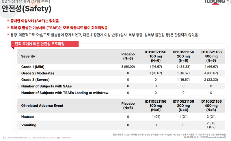 안전성 측면에서는 약물 적응을 위한 용량 적정(titration) 과정이 없었음에도 불구하고 위장관 부작용은 모든 코호트에서 중대한 이상 사례 없이 경미한 수준(Grade 1, mild)으로만 관찰됐다. 약물로 인한 임상 중단이나 중도 탈락자는 발생하지 않았다.