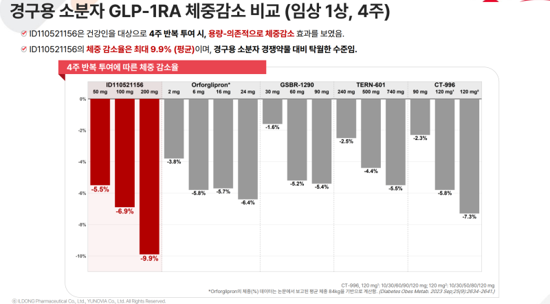 이는 글로벌 제약사 일라이릴리(Eli Lilly)의 경구용 GLP-1 작용제 ‘오포글리프론’이 고용량군(24mg)에서 보인 6.4% 체중감량을 앞서는 수치다.