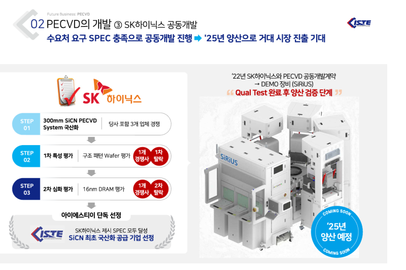 30일 아이에스티이 관계자는 "SK하이닉스와 양산 검증 단계에 있으며, 지난달 SK하이닉스 국산화 협력기업으로 소개됐다"며 "기술력은 SK하이닉스로부터 검증받았다고 보면 된다"고 말했다. 이는 양산 공급이 임박했음을 시사하는 대목이다.