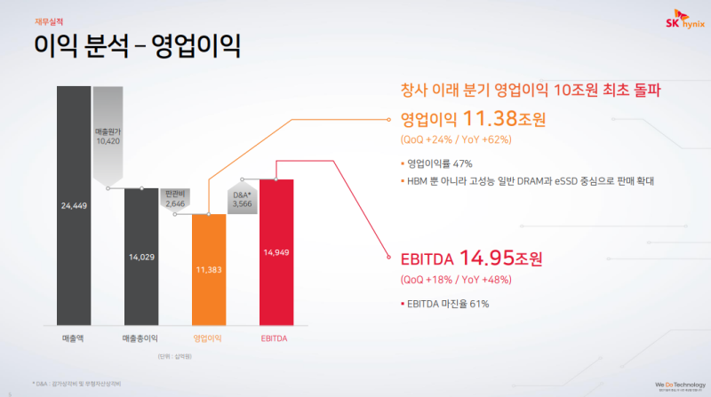• HBM과 고성능 일반 디램, 엔터프라이즈 SSD 중심의 판매 확대에 따라 영업이익은 창사 이후 처음으로 분기 기준 10조원 돌파