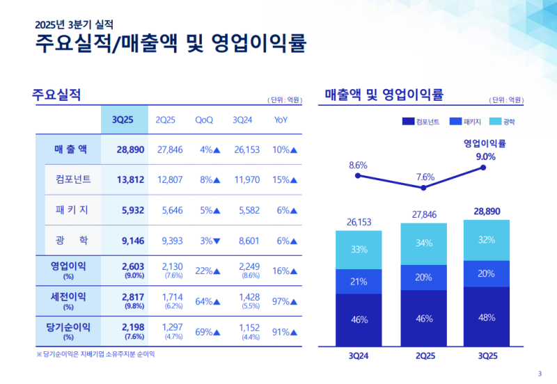 • 사업부별 매출은 컴포넌트 1조 3812억 원, 패키지 5932억 원, 광학 9146억 원으로 각각 전분기 대비 8%, 5%, 3% 수준 변화
