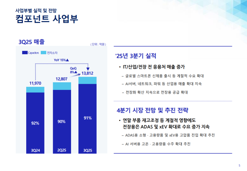 • 3분기에는 AI 서버용 MLCC·FCBGA, 전장용 MLCC·카메라 모듈 등 AI·전장 관련 고부가 제품 판매 확대가 지속되며 전분기 및 전년 대비 실적 개선