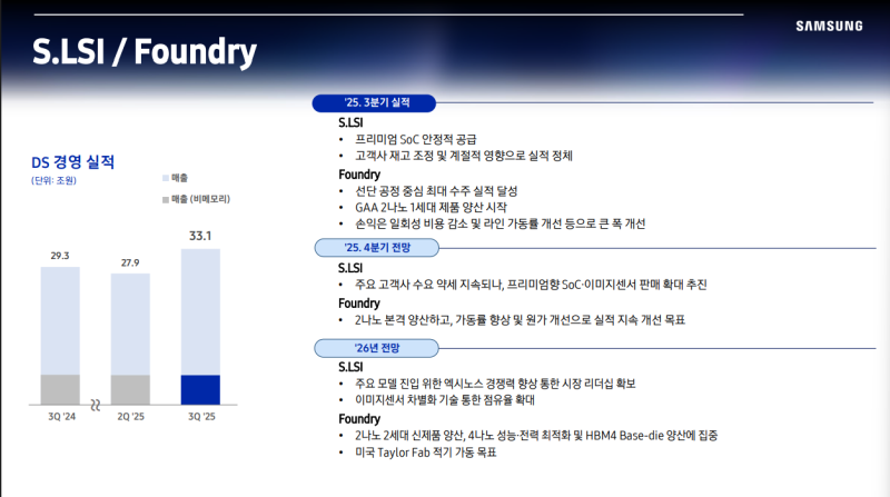 • 3분기에는 전분기의 일회성 비용 감소, 선단 공정 중심 가동률 개선, 원가 절감 효과가 더해지며 적자 폭이 크게 축소