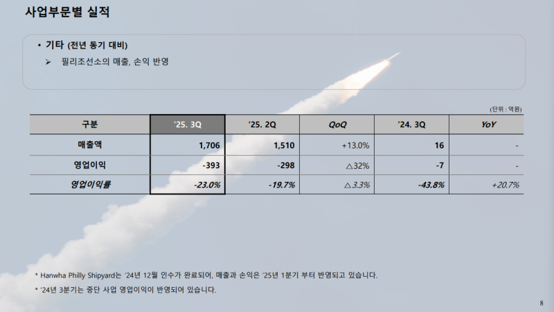 • 기타 부문(한화필리조선소 등)은 사업 추진 상황 및 시장 환경에 따라 실적 변동 가능성 존재