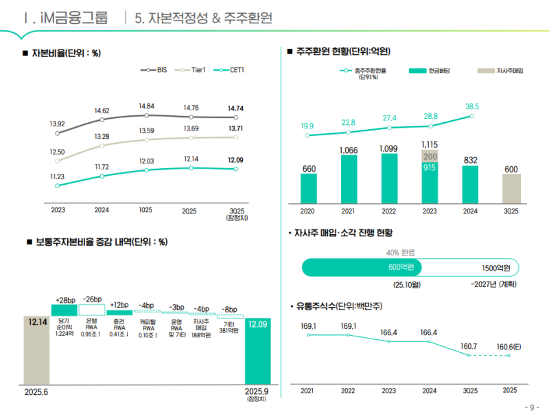 • 2025년 중 600억 원 규모 자사주 매입 완료, 2027년까지 총 1,500억 원 계획 중 40% 이행