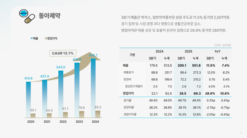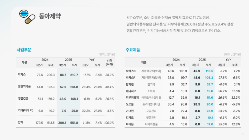 • 박카스부문(7월 이후 회복)과 일반의약품부문(피부외용제·신제품 중심 28.4% 성장) 기여