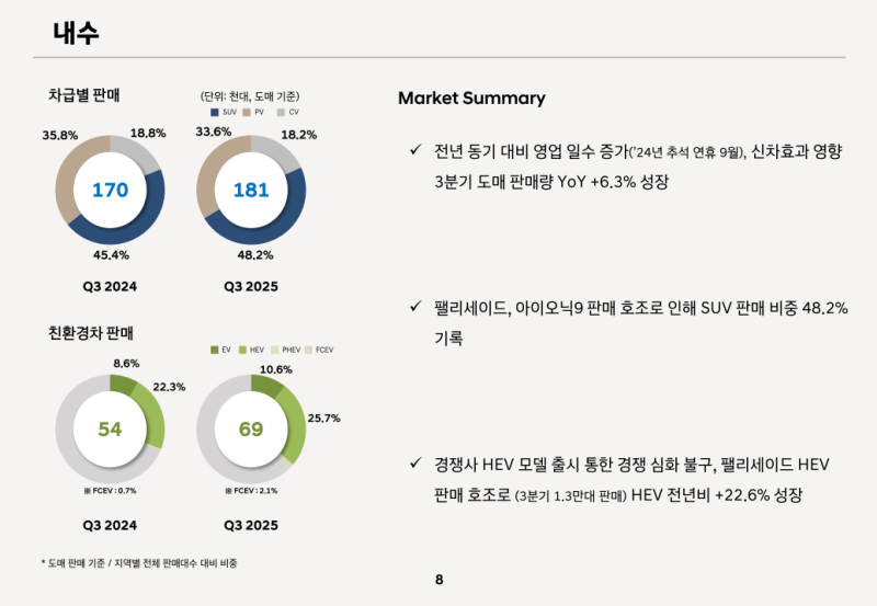 • 팰리세이드 및 아이오닉9 등 신차 효과로 SUV 판매 비중 48.2% 유지