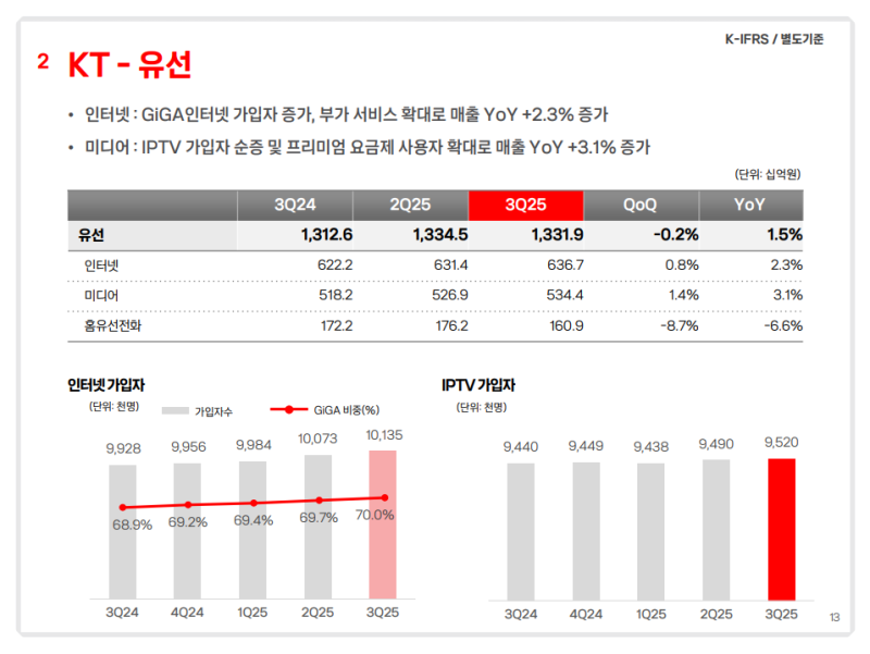• 미디어 사업은 IPTV 가입자 순증과 프리미엄 요금제 확대 영향으로 전년 동기 대비 3.1% 증가