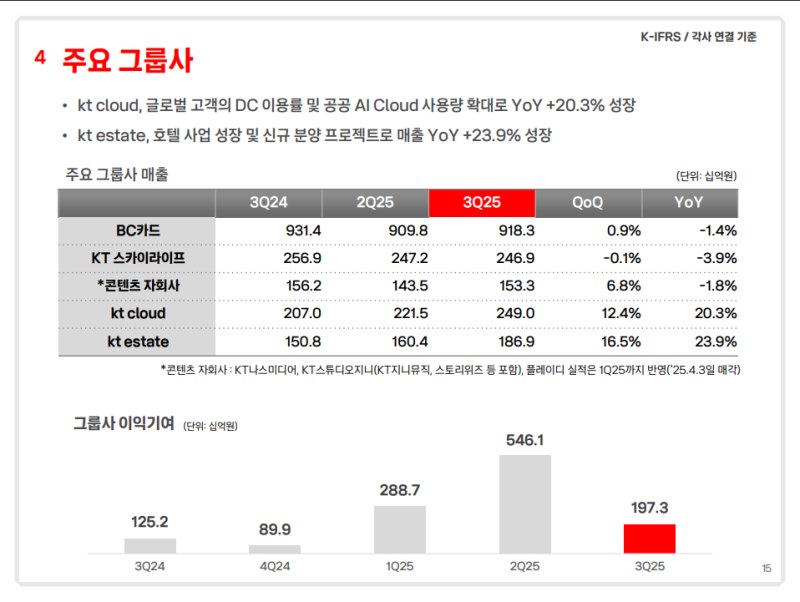 • KT Cloud, KT Estate 등 주요 자회사 실적 호조 (YoY +20.3%, +23.9%)