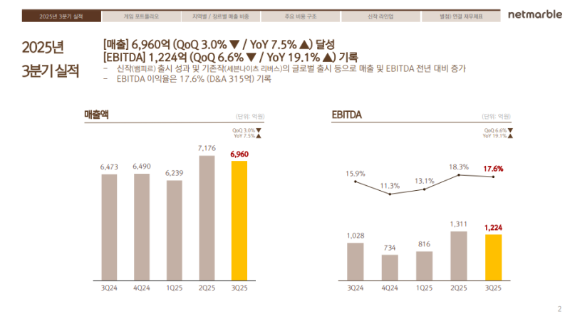• 매출과 EBITDA는 신작 ‘뱀피르’의 국내 성과와 ‘세븐나이츠 리버스’의 글로벌 출시 영향으로 전년 동기 대비 증가