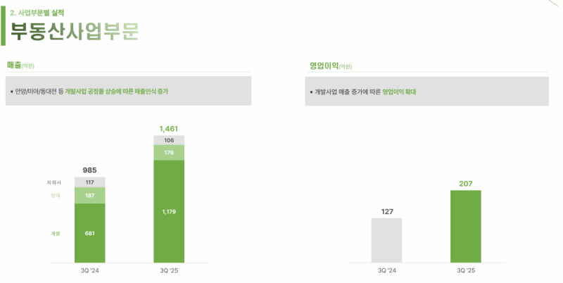 • 부동산 사업부: 매출액 1,461억원(+48.3% YoY), 영업이익 207억원(+63.0% YoY, OPM 14.2%) 안양·미아 등 중소형 개발사업 매출 인식 확대로 실적이 개선