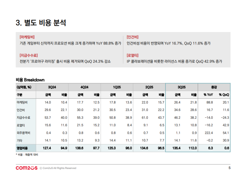 • 주력 타이틀과 신규 출시 게임의 마케팅비가 동시에 확대되며 비용 부담 증가