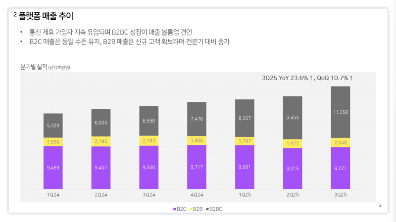 • 플랫폼 구독 사업 매출은 통신 제휴 채널 집중 전략이 유지되며 B2B2C 성장이 매출 증가를 견인