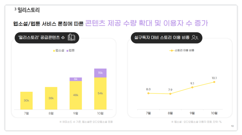 • 웹소설·웹툰 론칭 이후 콘텐츠 제공 수가 증가했으며 10월 말 기준 웹소설은 약 5만 4천 개(에피소드 기준), 업계 기준으로는 약 4천 개 수준의 에피소드 구조를 의미