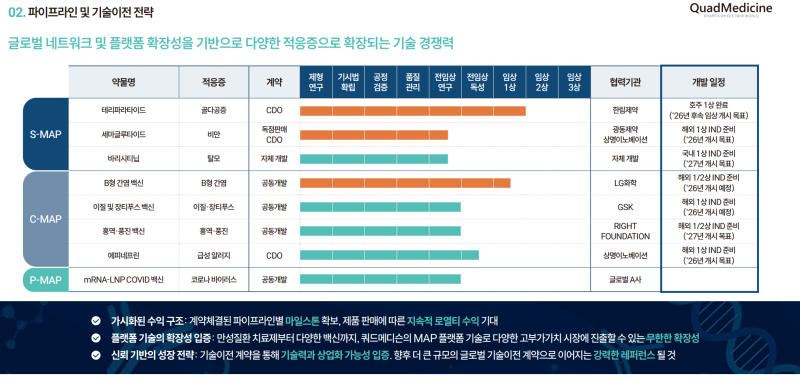 쿼드메디슨은 현재 총 8개 적응증에 대한 파이프라인 개발을 진행하고 있다.