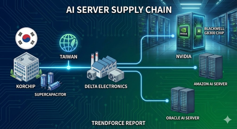 시장조사기관 트렌드포스는 보고서를 통해 "엔비디아의 GB300 출시가 전 세계 슈퍼커패시터 개발 경쟁에 불을 지폈다"며, 한국의 주요 기업으로 비나텍과 함께 '코칩(Korchip)'을 명시했다. AI 서버의 전력 소모량이 급증하면서, 안정적인 전력 공급과 백업을 위한 슈퍼커패시터가 필수 부품으로 떠오른 것이다.