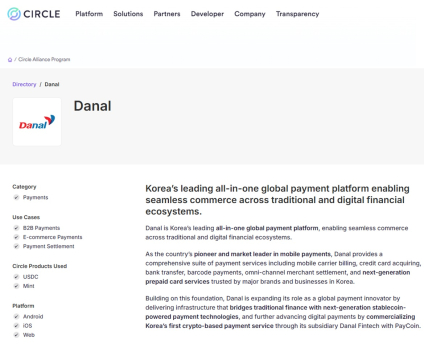 다날은 최근 국내 결제사 최초로 CAP 파트너로 인정받아 최종 협의를 마쳤으며, 서클 공식 홈페이지에 파트너사로 등재됐다. 다날은 이번 합류를 통해 법제화 환경에서 안정적인 운용이 가능한 국내 USDC 결제 인프라 구축을 우선 검토한다.