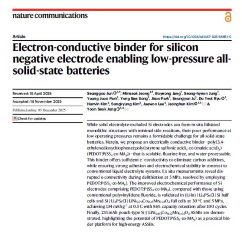 이번 연구 결과는 국제 학술지 ‘네이처 커뮤니케이션스(Nature Communications)’에 게재됐다. 학계에서는 기존 액체 전해질 기반 배터리에서 활용이 제한됐던 전도성 고분자 소재를 전고체 환경에서 성공적으로 구현했다는 점에 주목하고 있다.