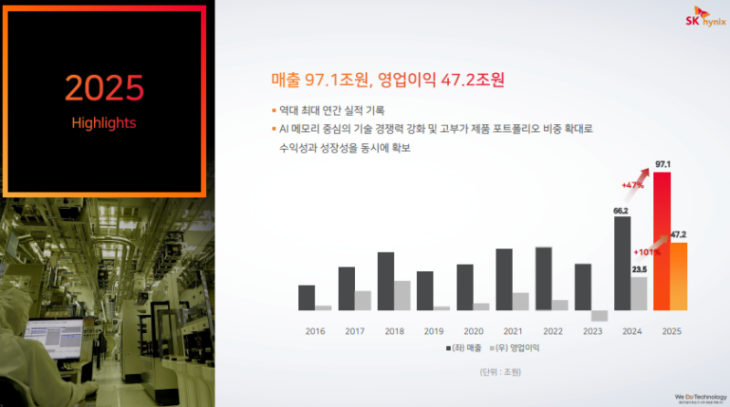 • 그 결과 2025년 연간 매출은 97.1조 원, 영업이익은 47.2조 원 기록(YoY +47%, +101%)