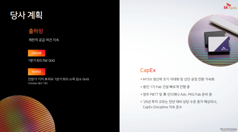 • AI 서버 확산으로 HBM, 서버 DRAM, 엔터프라이즈 SSD 수요가 동시에 증가하고 있으며, 고객과 회사 재고 모두 타이트한 상태가 지속