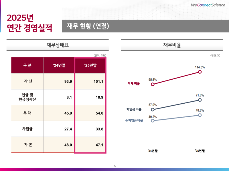 • 2025년 말 연결 기준 자산 총계는 약 101조 원이며 부채는 약 54조 원, 자본은 약 47조 원 수준