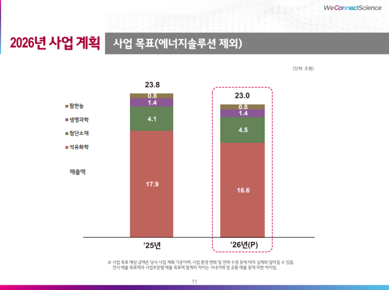• 전망 공시를 통해 안내한 바와 같이 2026년 매출 계획은 에너지솔루션 제외 기준 약 23조 원 목표