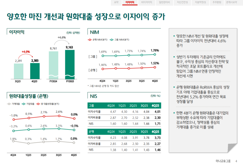 • 2025년 연간 그룹 이자이익은 9조 1,634억 원(YoY +4.6%)