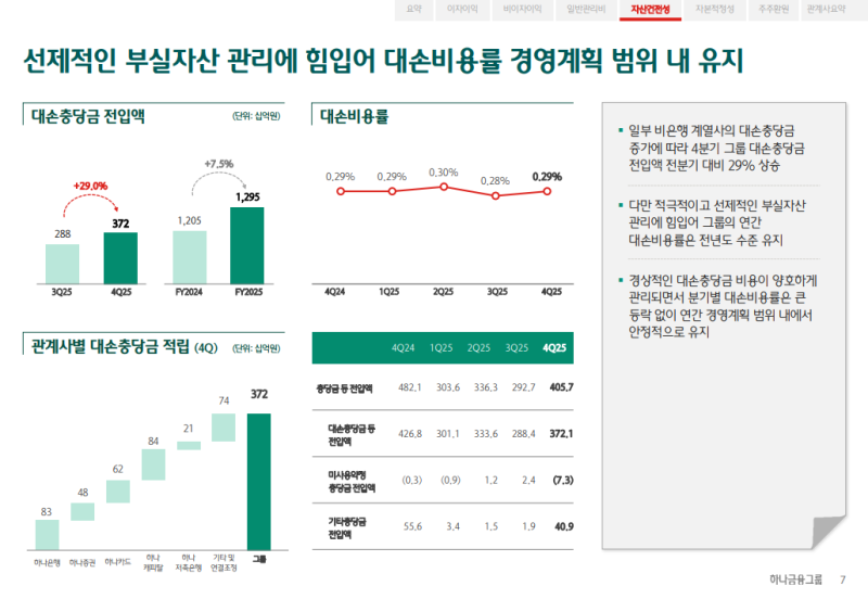 • 4Q25 그룹 대손충당금 전입액은 3,721억 원(QoQ +29%)
