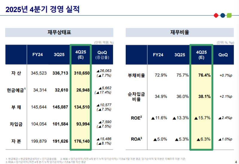 • 4분기 말 기준 자산 약 31조 원, 부채 약 13조 원, 자본 약 18조 원이며 부채비율 76% 기록
