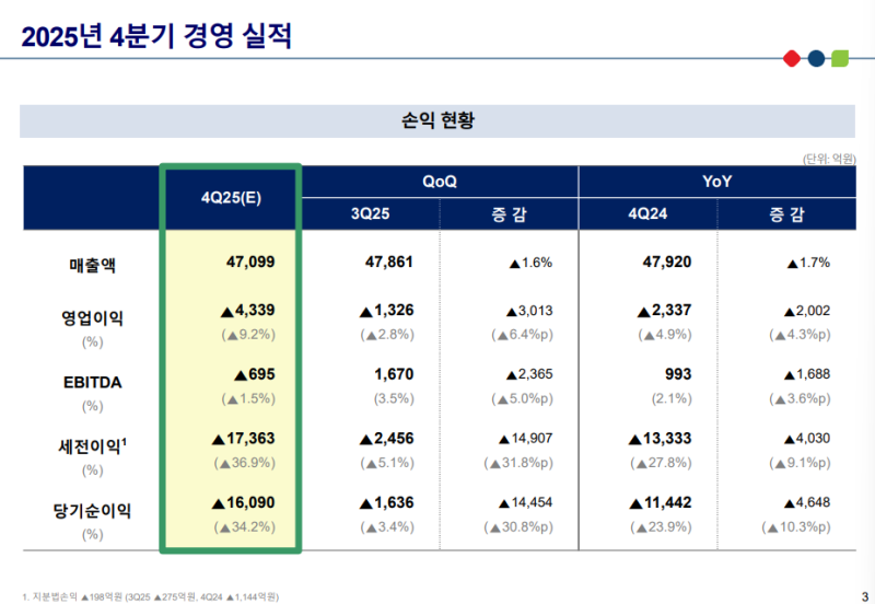 • 연말 고객사 재고 조정 및 계절적 비수기 진입 영향으로 판매량이 감소하며 전분기 대비 수익성 하락