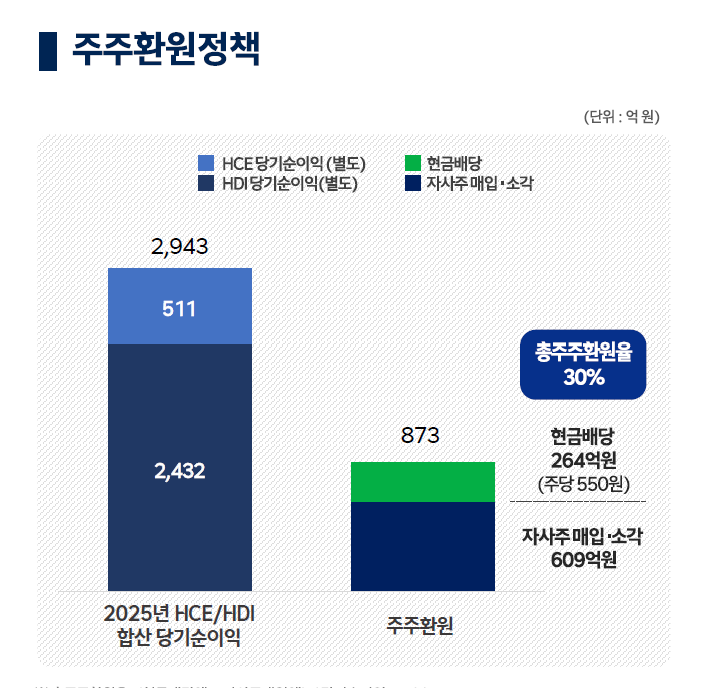 • 2025년 순이익의 30% 수준인 873억 원을 주주 환원에 활용