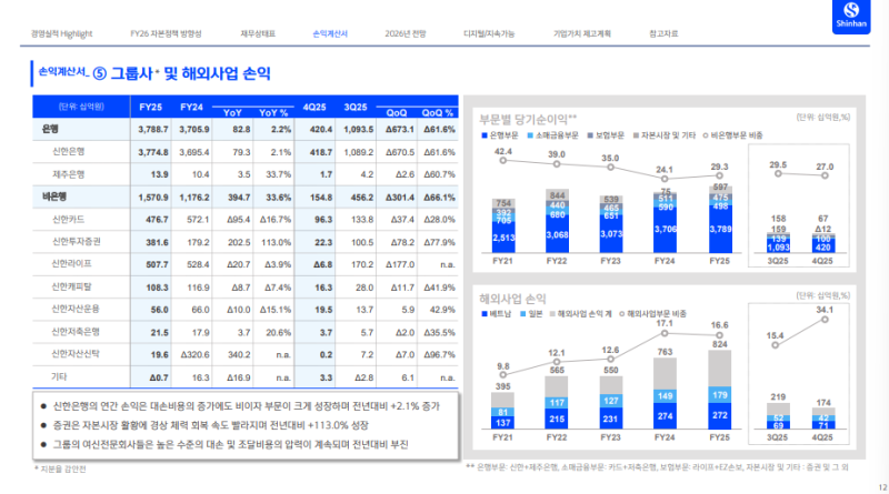 • 그룹 연간 당기순이익 4조 9,716억 원(YoY +11.7%), 비이자 중심 영업이익 성장, ELS 등 과징금 인식에도 불구 비용 요인 통제