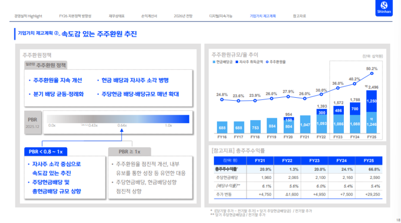 • 총 주주환원율 50% 조기 달성, 절대 수치 집착보다 ROE·자본여력 기반의 탄력적 운용 기조